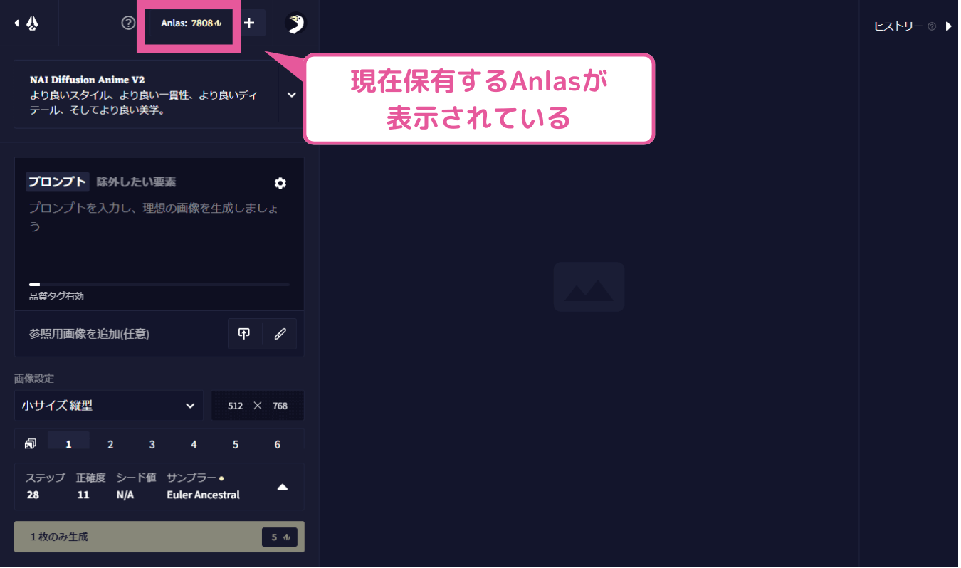 これがイラスト生成の画面です。上の方に現在保有しているAnlasが表示されているので確認しましょう。